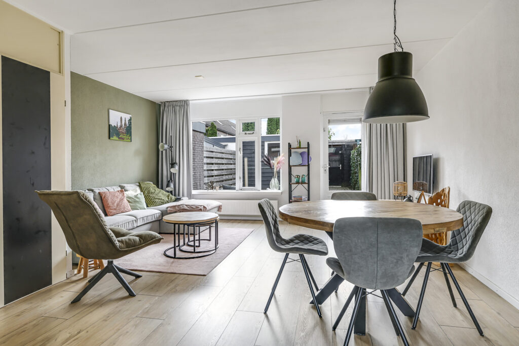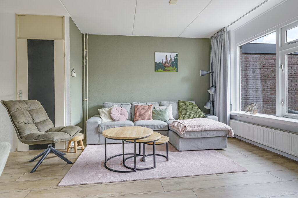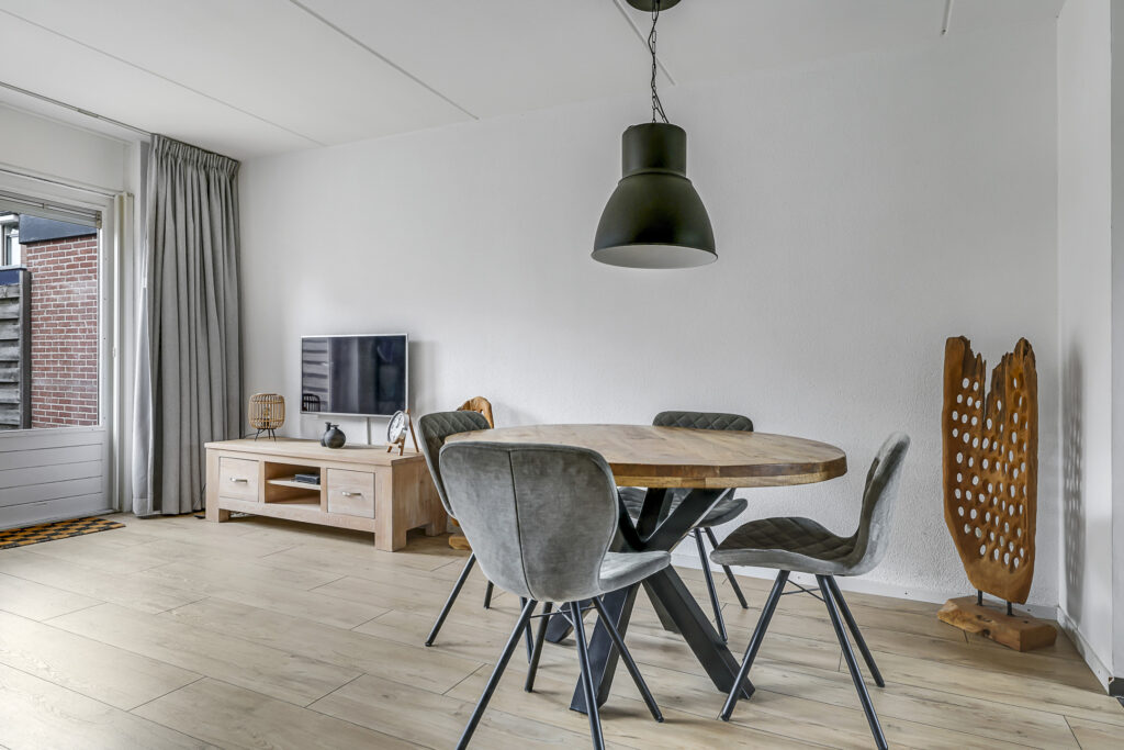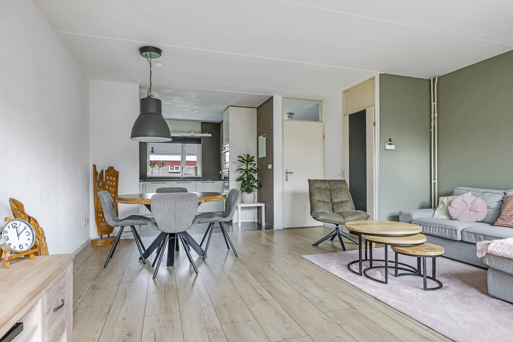 De woonkamer is aan de achterzijde gelegen en over de volle breedte van de woning gesitueerd. De grote raampartij met tuindeur zorgt voor veel lichtinval en een directe verbinding met de zonnige tuin. Door de vierkante indeling laat de ruimte zich eenvoudig inrichten met een gezellige zithoek en eethoek. De laminaatvloer geeft een warme uitstraling en de trapkast met ingebouwde schappen biedt praktische bergruimte.