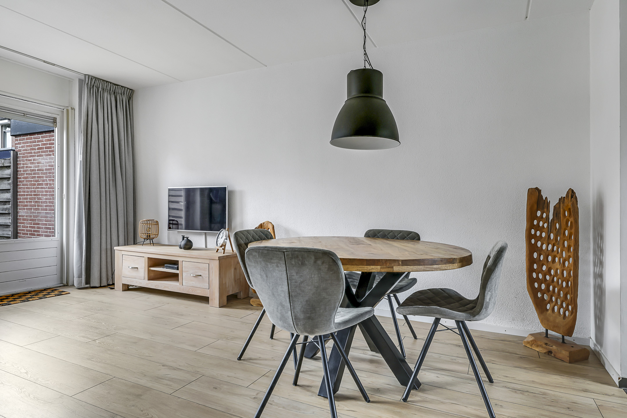 Tuingerichte woonkamer met laminaatvloer, trapkast en tuindeur