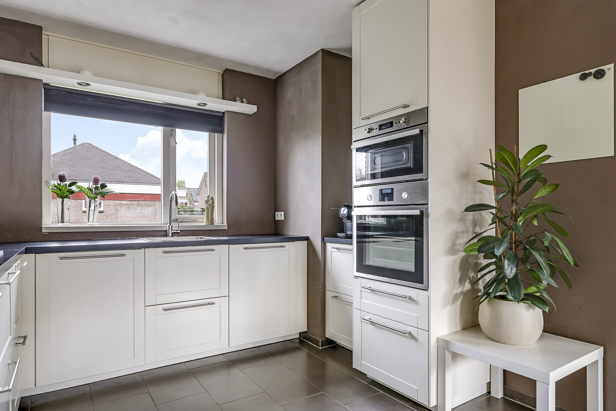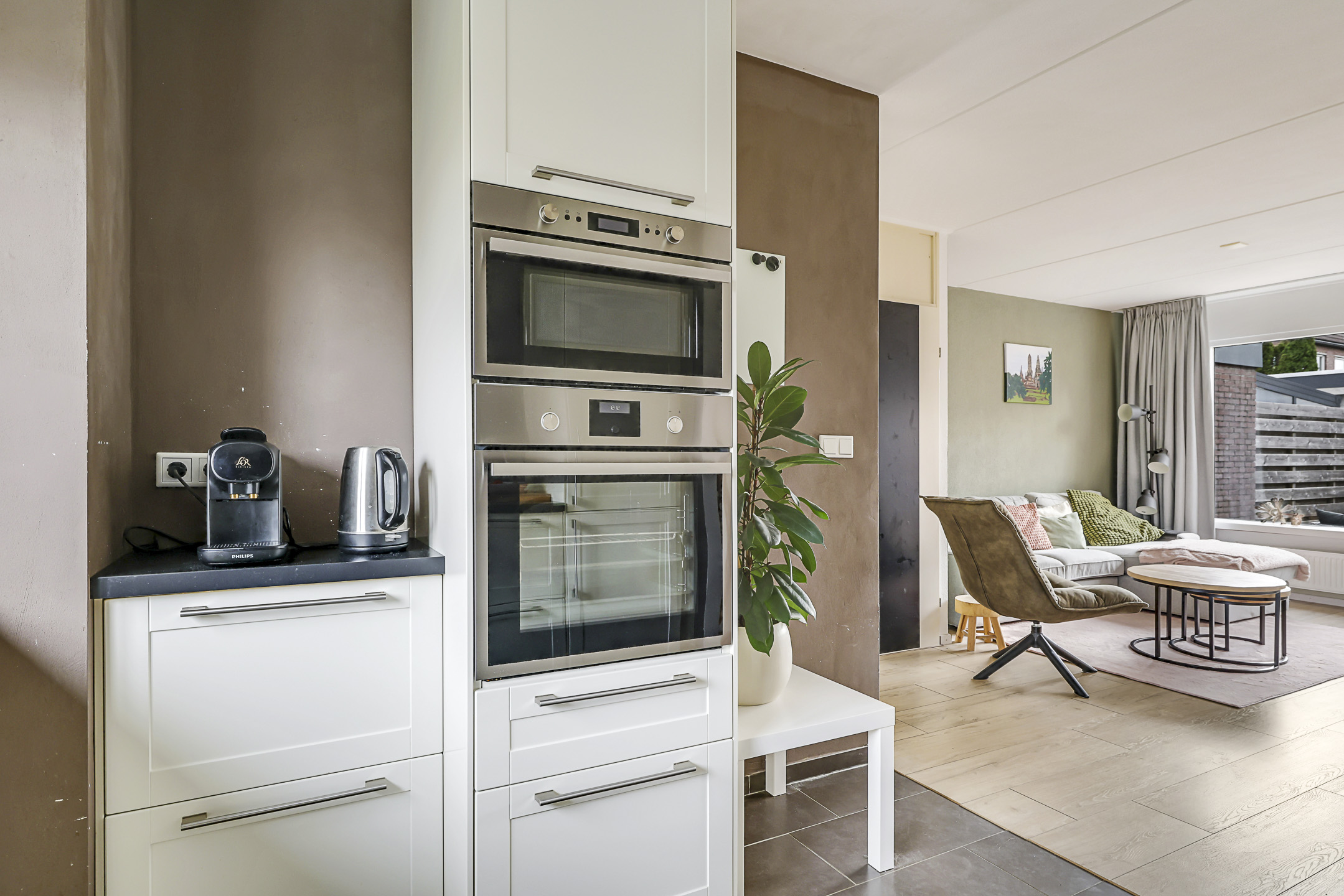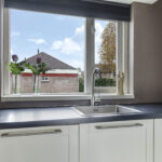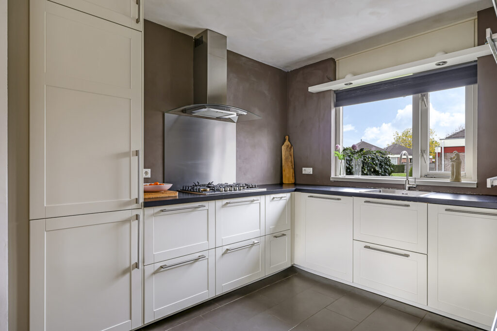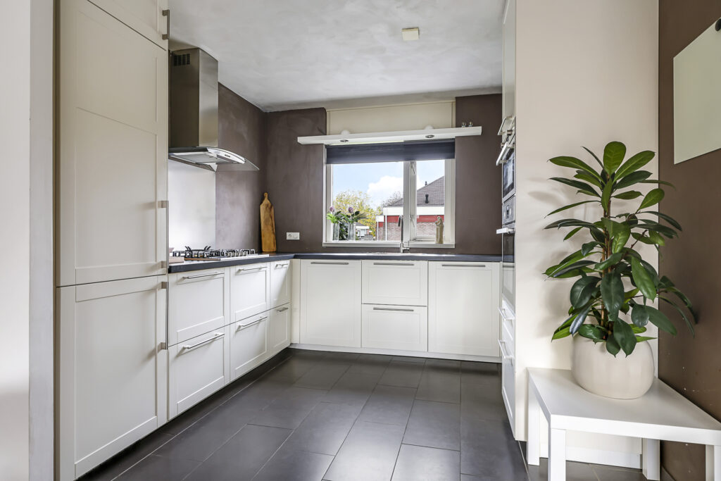 Aan de voorzijde bevindt zich de moderne keuken welke is geplaatst in een hoekopstelling en is voorzien van een neutrale kleurstelling. De keuken is compleet ingericht met diverse inbouwapparatuur, zijnde een 5-pits gaskookplaat, een afzuigschouw, een vaatwasser, een koel/vriescombinatie, een grote hete lucht oven en een combi-oven/magnetron. Brede ladekorven met verdekte besteklades en een draaicarrousel in de hoek kom je hier geen opbergruimte tekort. In de hoek van de keuken tref je nog een koffiecorner. In de keuken liggen plavuizen welke zijn voorzien van aangename vloerverwarming. Aan de voorzijde van de woning kijk je uit op een groenstrook waardoor je tijdens het koken prettig van je afkijkt.