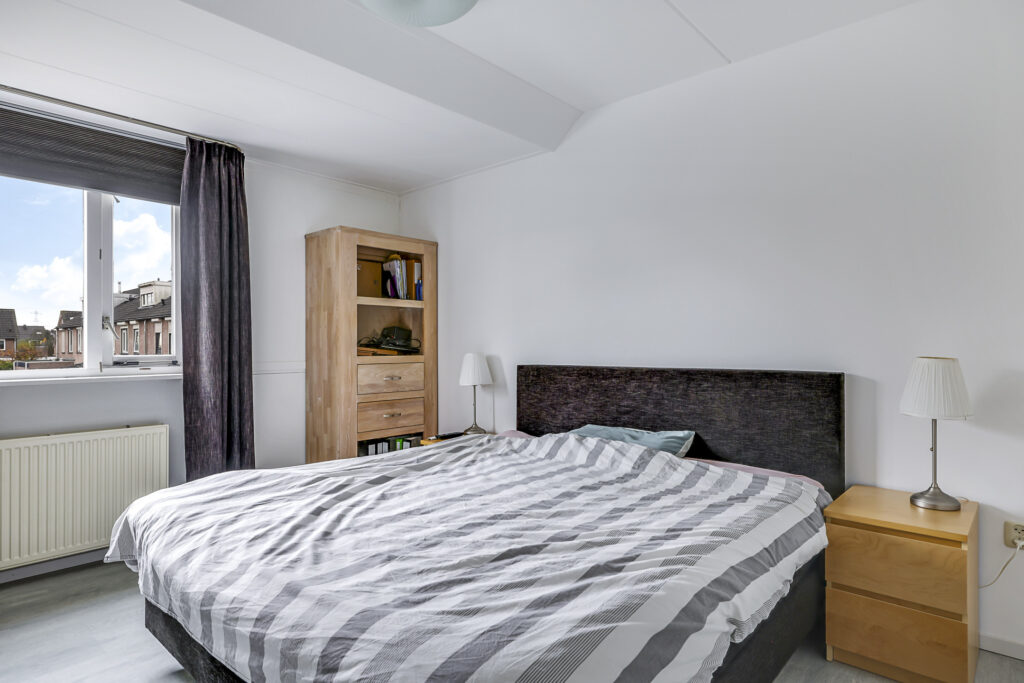 De eerste verdieping is verrassend ruim ingedeeld met drie slaapkamers en de badkamer. Opvallend is dat de dakkapel aan de achterzijde over de maximale breedte is geplaatst, hierdoor zijn de schuine dakvlakken op achtergelegen slaapkamers helemaal verdwenen. Ook aan de voorzijde is een dakkapel geplaatst waardoor ook de hoofdslaapkamer en de badkamer zijn vergroot en eenvoudiger zijn in te richten. De kamers zijn respectievelijk 12m², 9m² en 7m² groot. De laminaatvloer is drempelloos doorgelegd wat zorgt voor een eenduidig geheel.