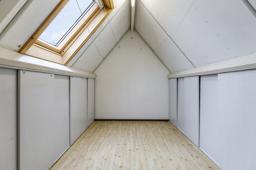 Via een 2e vaste trapopgang bereik je de 2e verdieping. Dit betreft een open, multifunctionele ruimte. Onder beide schuine dakvlakken zijn knieschotten geplaatst waardoor je veel spullen uit het zicht kan opbergen. Het grote dakraam is enkele jaren gelegen vernieuwd en zorgt voor de nodige lichtinval. Op deze verdieping tref je tevens de witgoedaansluitingen en de opstelling van de cv-ketel aan.