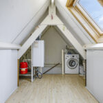 Open zolderruimte met dakvenster, knieschotten, witgoedaansluiting en CV-opstelling