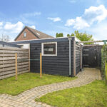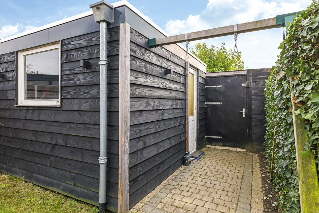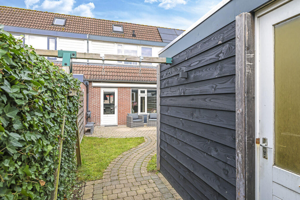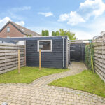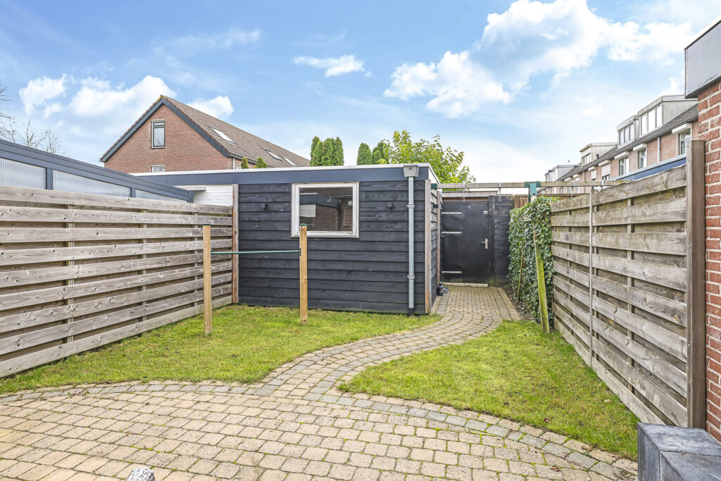 Deze woning wordt compleet gemaakt met een zonnige, diepe achtertuin. Met ca. 11 meter diepte is hier meer dan genoeg tuin om in te genieten. De tuin is opgedeeld in een terras en grasgazon wat zorgt voor een groene uitstraling. De ligging op het zuiden zorgt voor veel zon gedurende de dag. Aan de achtergevel is dan ook over de volle breedte zonwering geplaatst, deze wordt ter overname aangeboden. De stenen schuur is vergroot (ca 4 x 4 meter) waardoor je hier geen opbergruimte tekort zal komen. Naast de schuur is een achterom aanwezig. Opvallend is de gunstige ligging ten opzichte van de achtergelegen bebouwing. Doordat de woning haaks op deze staan, geniet je hier van weinig inkijk wat zorgt voor veel privacy.