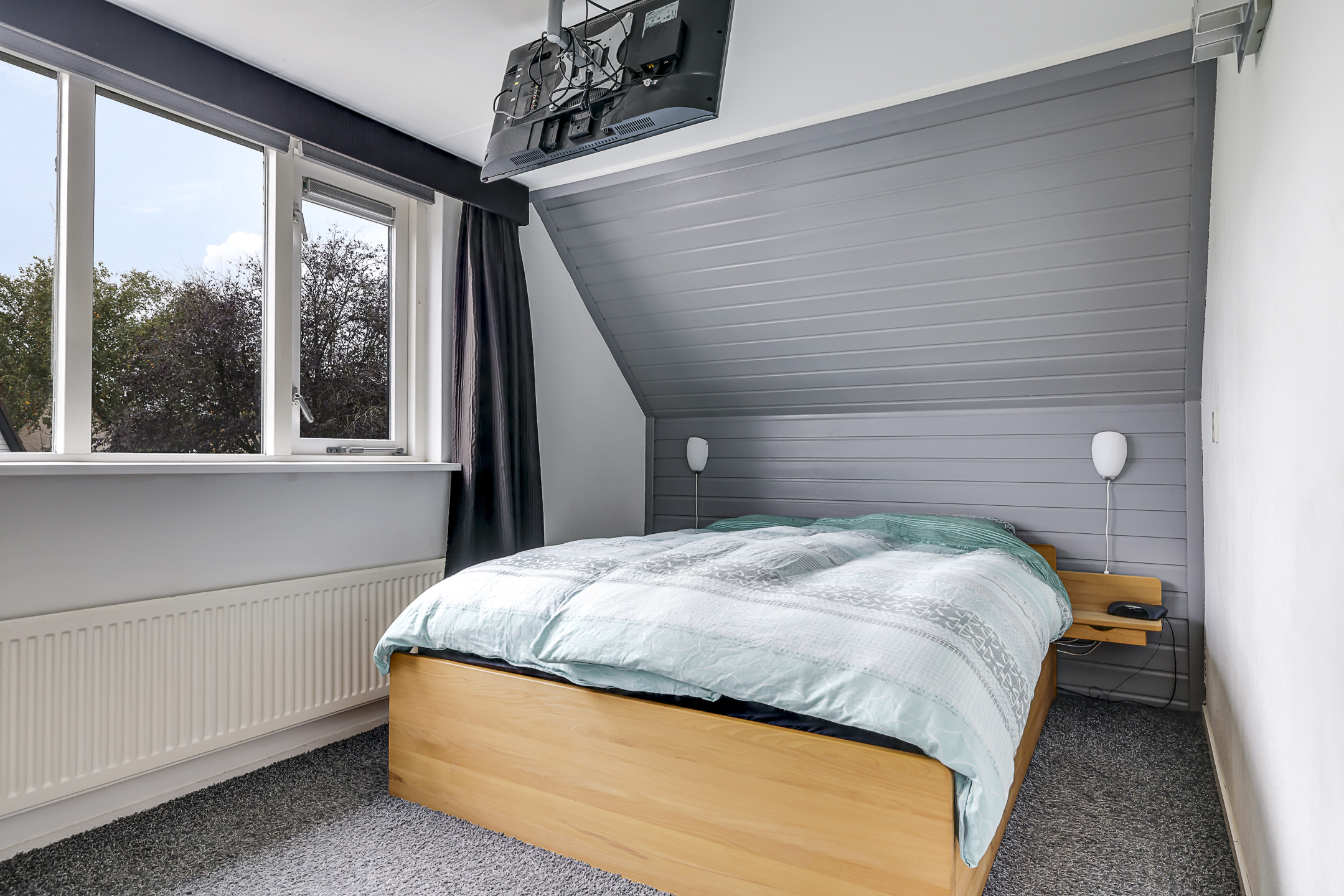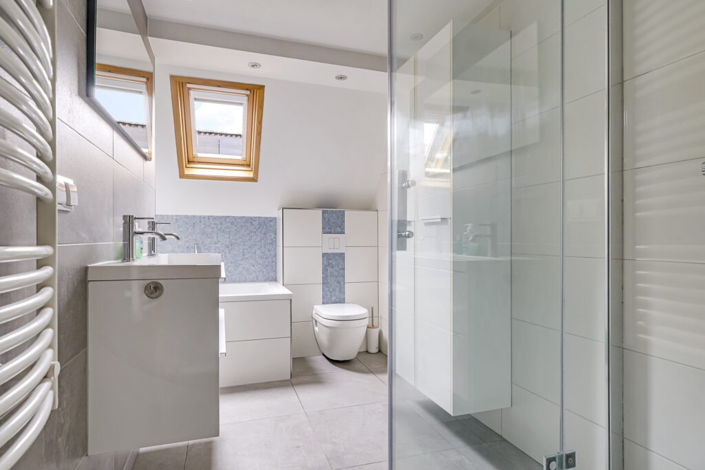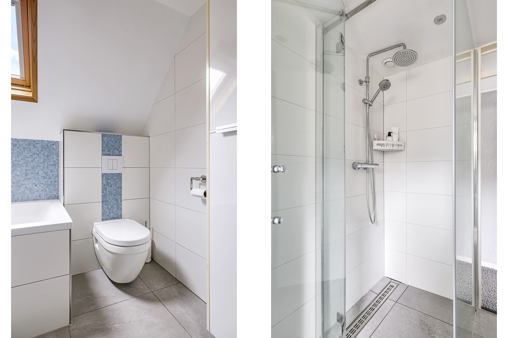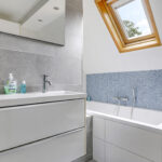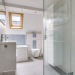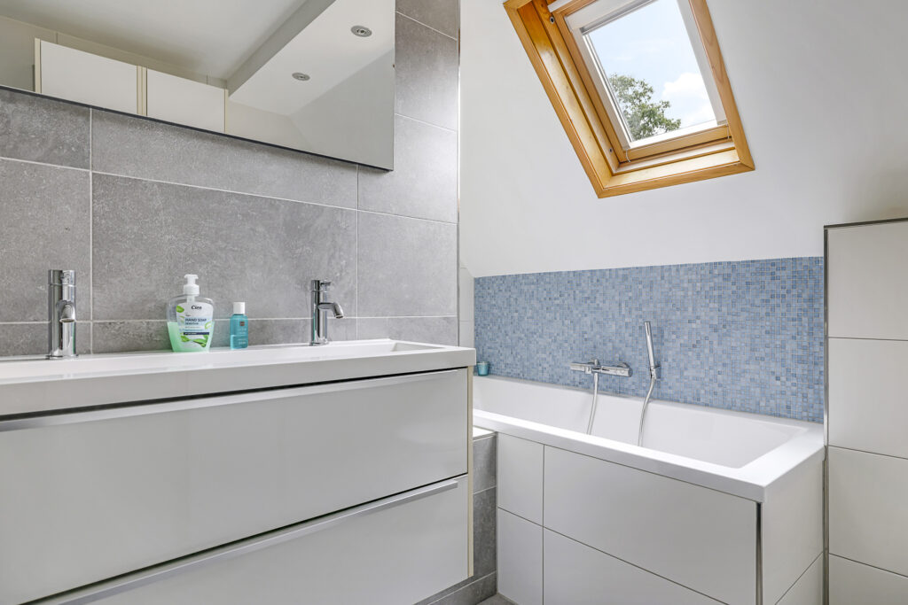 Net als de keuken is ook de badkamer modern en neutraal te noemen. Moderne elementen waaronder een inloopdouche met rainshower en drainafvoer, een breed 2-persoons wasmeubel met lades en een 2e toilet die zwevend is uitgevoerd, ga je hier tegenkomen. En uiteraard mag een volwaardig ligbad niet ontbreken. Ook zijn een handdoekradiator en inbouwspots niet vergeten. En een groot voordeel is toch wel het Velux dakvenster (v.v. verduistering) die niet alleen voor daglicht zorgt, maar ook een prima ventilatiemogelijkheid biedt. Overigens is er tijdens de modernisering ook een nieuwe mechanische ventilatie-unit (met afstandsbediening) aangebracht.