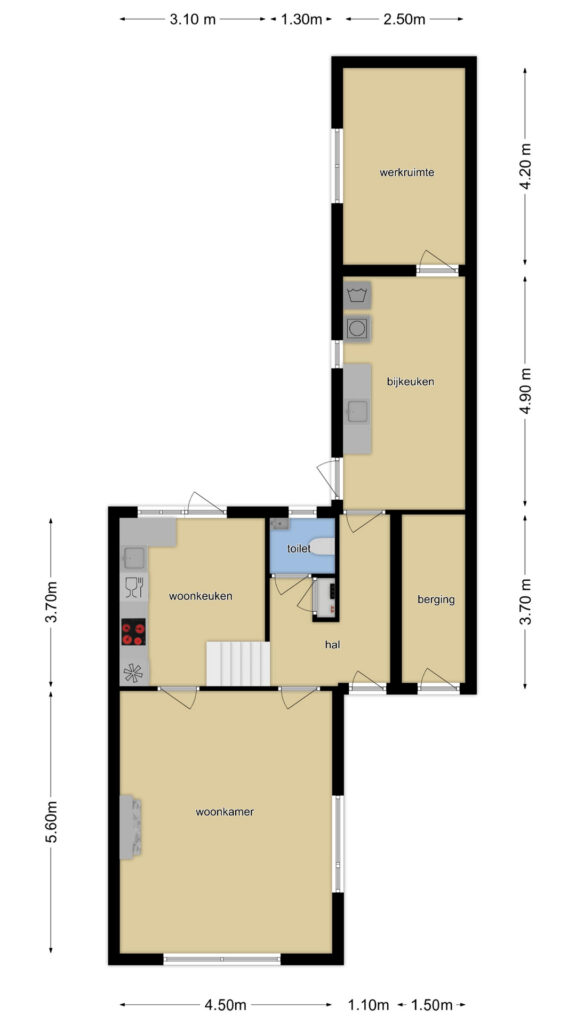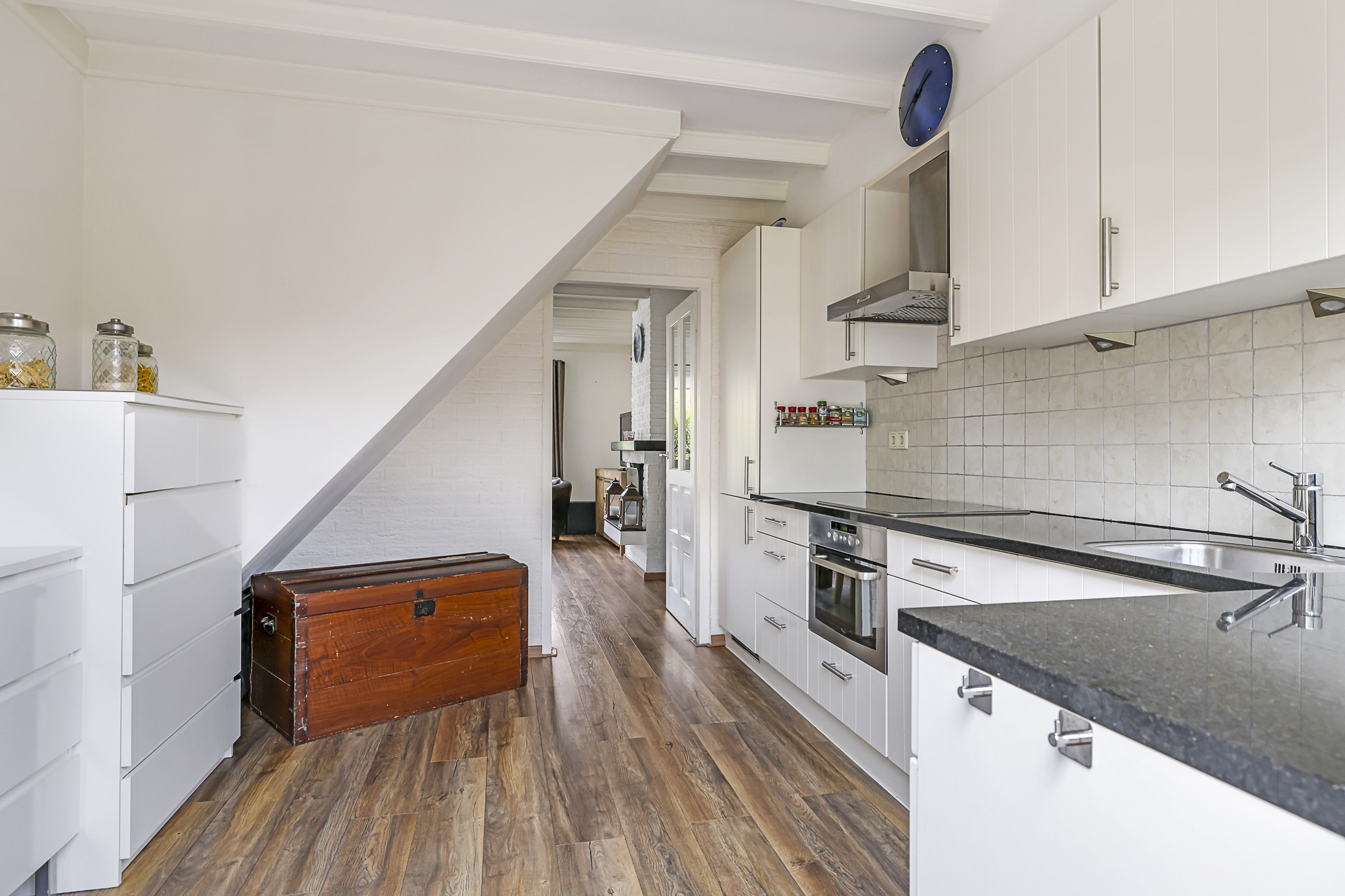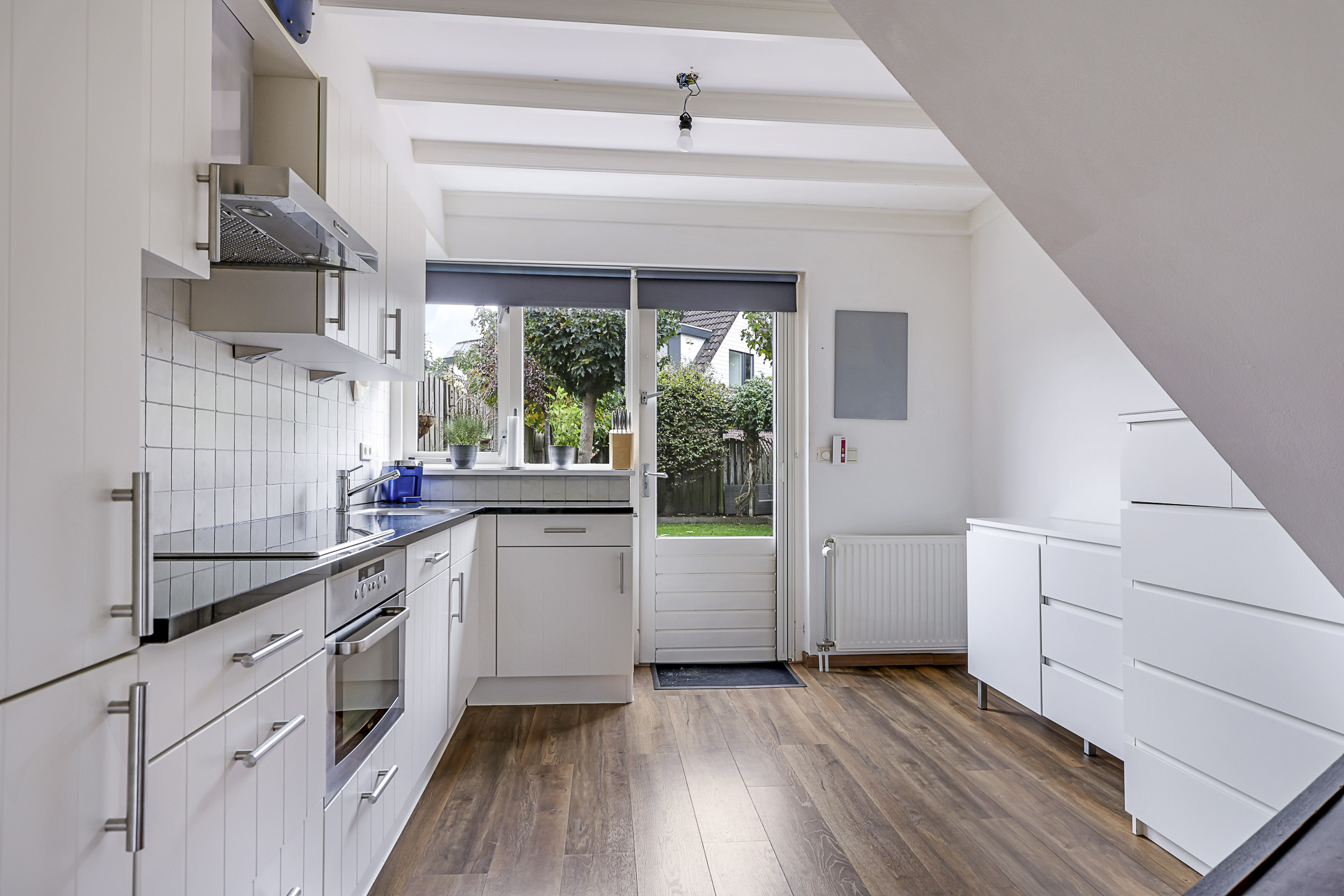 Ondanks dat de keuken direct aan de woonkamer grenst, is de keuken af te sluiten met een tussendeur. Doordat de keuken ruim van opzet is, kunnen we spreken van een woonkeuken. Er kan namelijk prima een 4-persoons eettafel staan. Hierdoor hoef je ook niet per se een eettafel in de woonkamer kwijt, waardoor er meer inrichtingsmogelijkheden zijn. Ook is er nog iets ruimte onder de trap, een ideaal speelhoekje voor kleine kinderen.