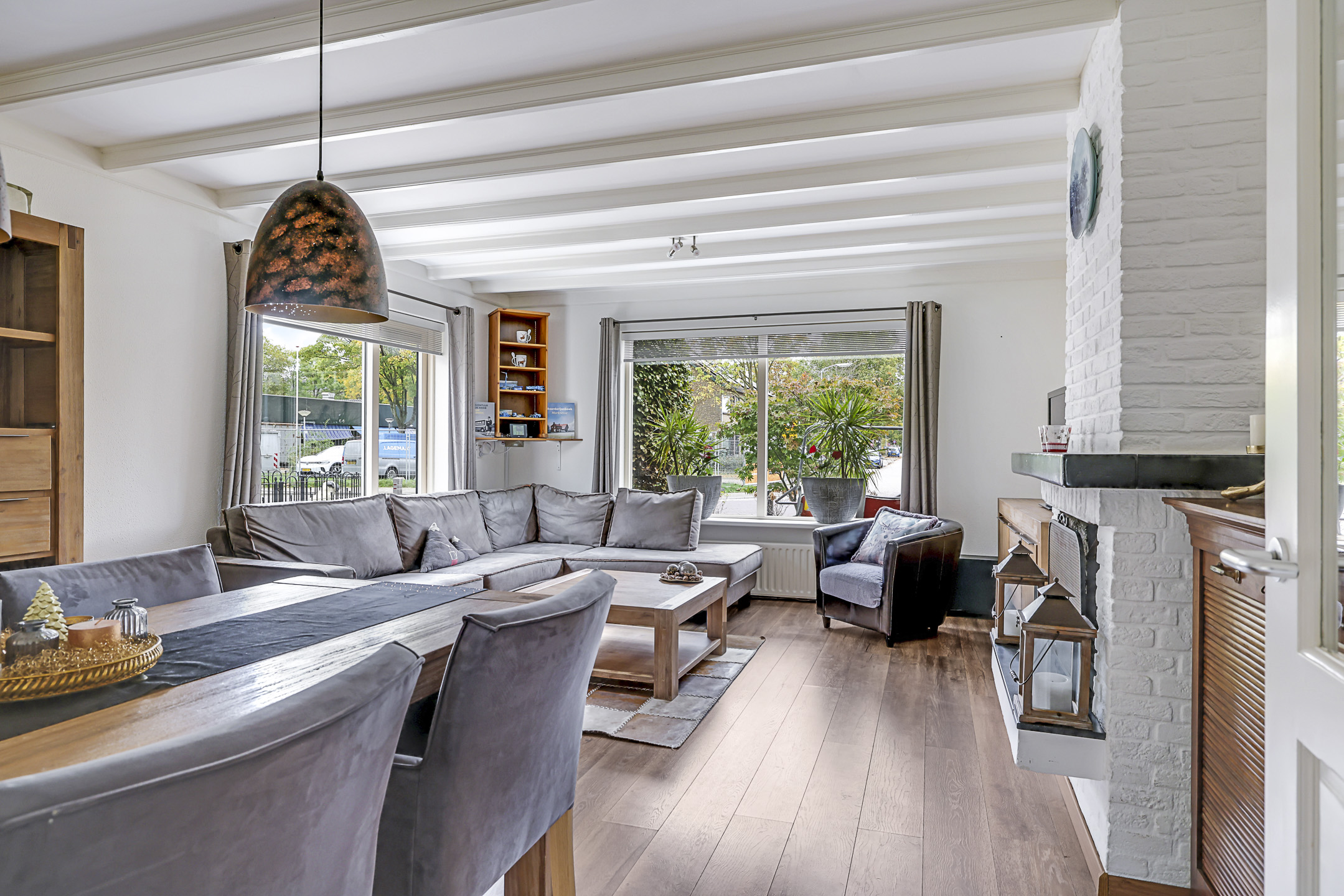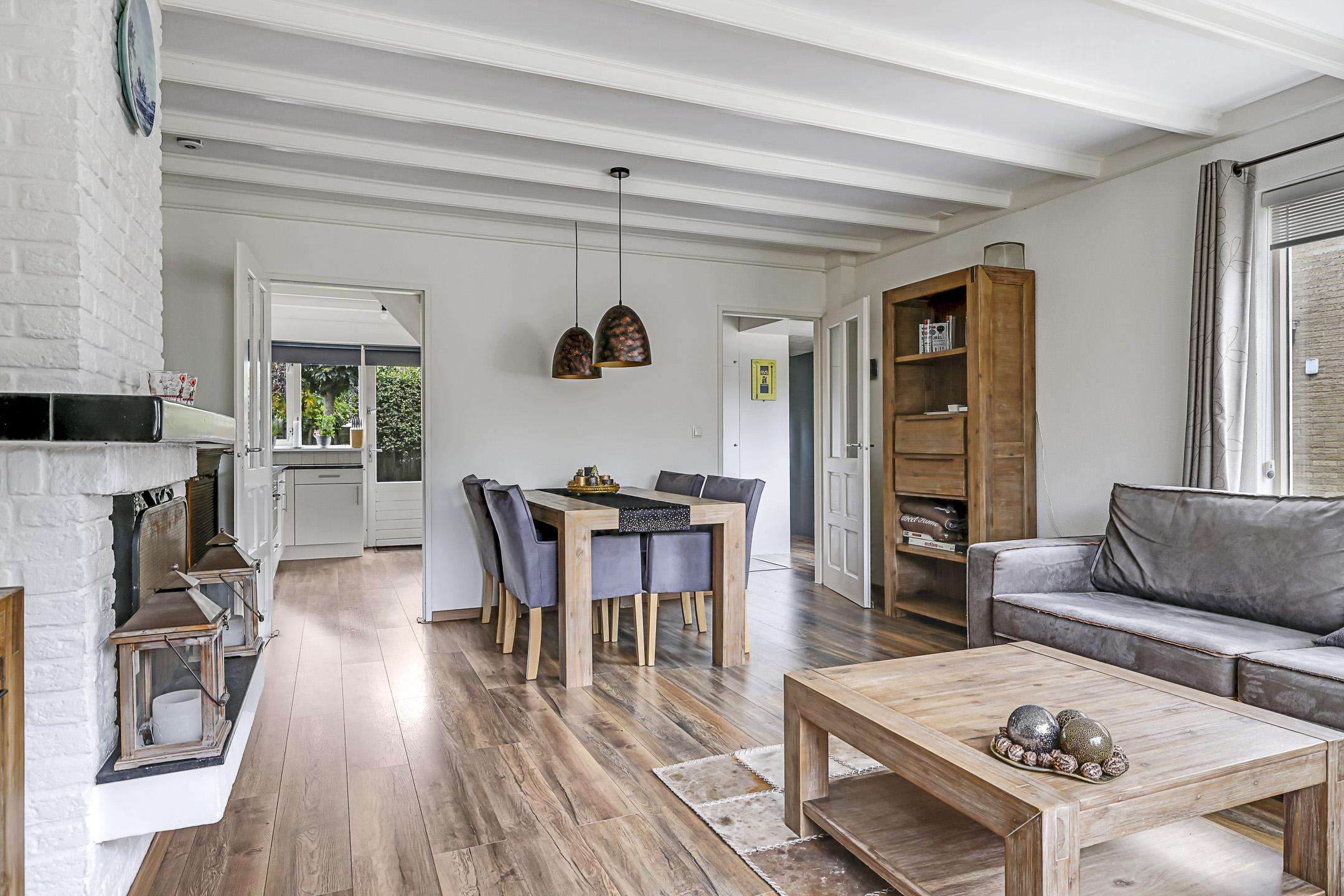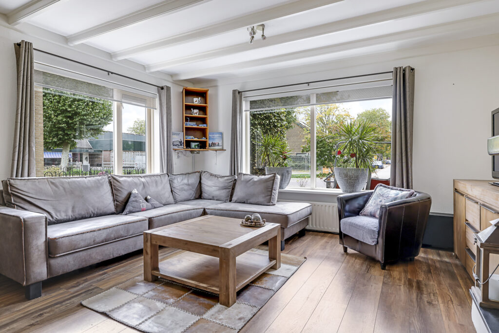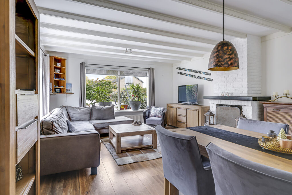 De woonkamer is aan de voorzijde gelegen en heeft een vrij uitzicht de straat in. Dit geeft een vrij gevoel en je kijkt niet bij buren naar binnen (en andersom). Een leuk element in de woonkamer is de openhaard die voor sfeervolle winteravonden kan zorgen. De haard is voorzien van een Belgisch hardstenen plateau wat het tot een strak geheel maakt. Op de vloer licht een laminaatvloer met een warme kleurtint. En ben je gevoelig voor lichtinval Door het extra zijgevelraam zal het overdag nooit te donker zijn.