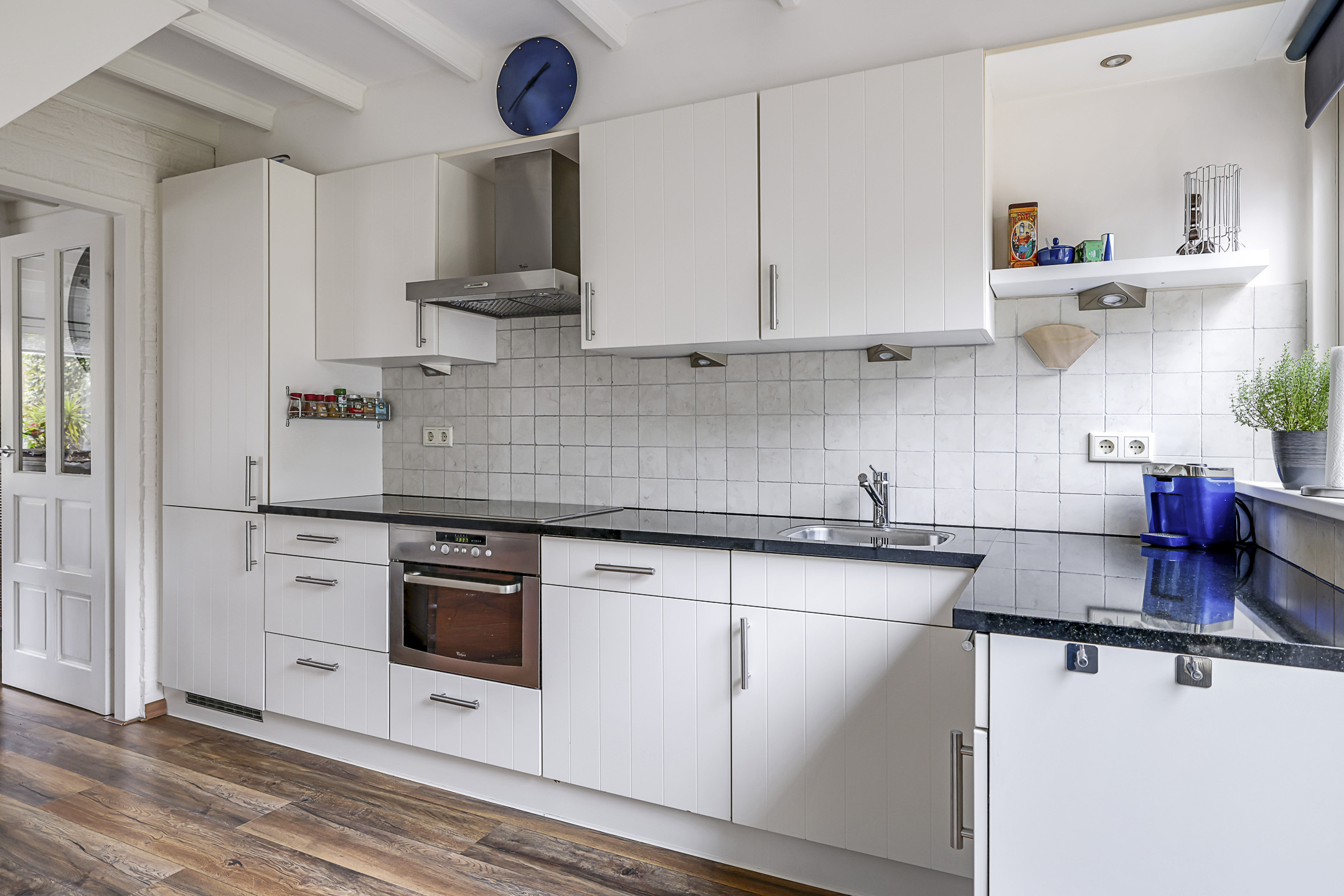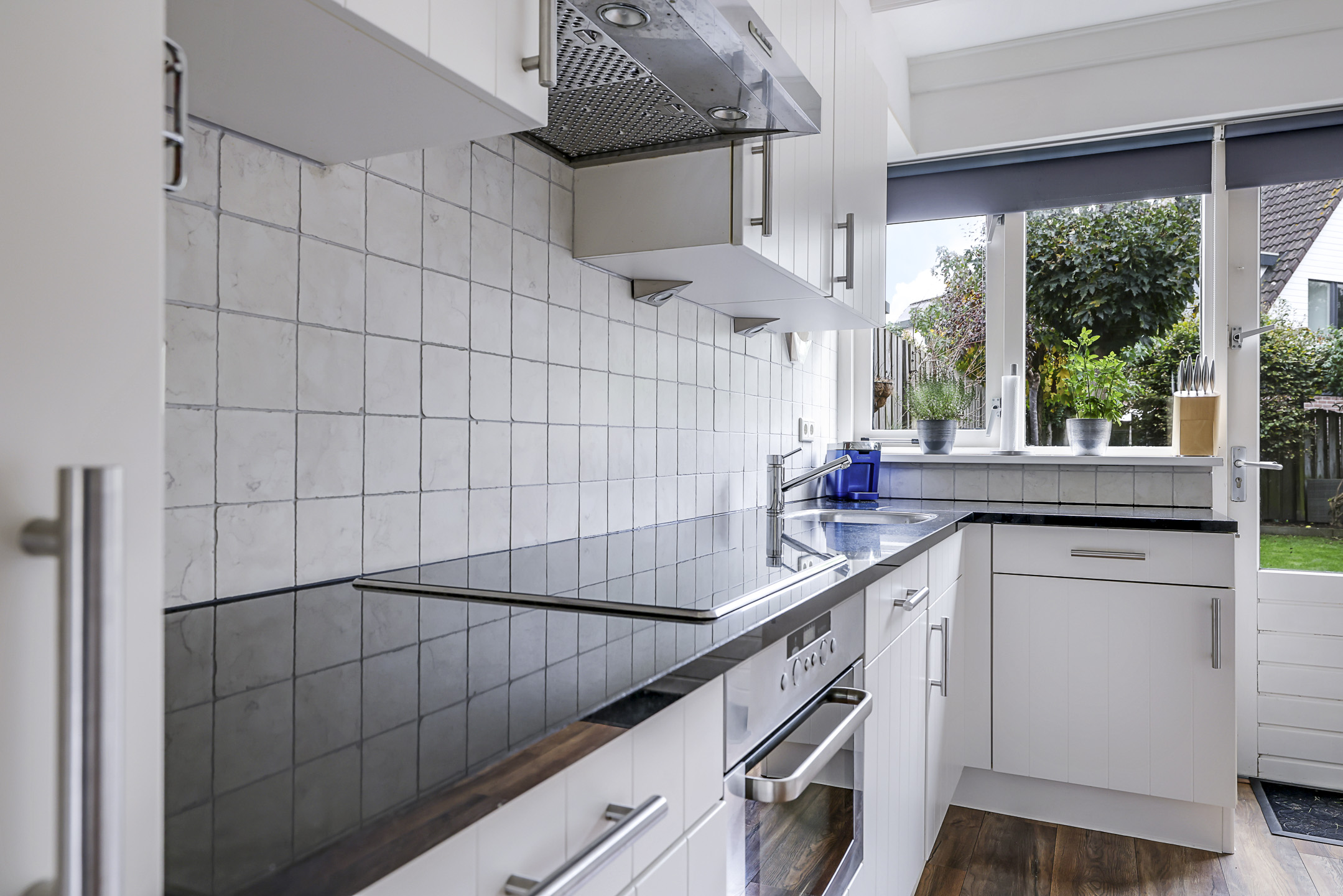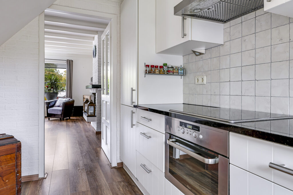 De keuken is modern en luxe te noemen, mede doordat het een zwart granieten aanrechtblad heeft en voorzien is van inbouwapparatuur. Hierbij moet je denken aan een vaatwasser, een combi-oven, 4-pits keramische kookplaat met afzuigschouw en een koel/vriescombi. Noemenswaardig is de hoekkast met “Le-man-slede”, een luxe en erg praktische, uitschuifbare pannenkast waardoor je overal bij kunt. Overigens heeft de keuken ook nog een tuindeur (met rolhor) waardoor er een directe verbinding is met de achtertuin. Op een zomerse dag lekker buiten eten is daardoor een goede optie.