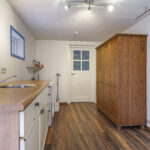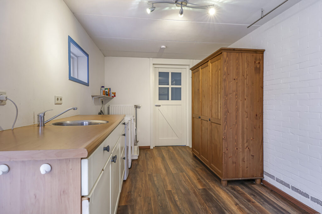 Via een speels ingedeelde hal met o.a. een toilet, meterkast en garderobe, komen we terecht in de bijkeuken. Deze ruimte is meer dan 12m² groot en erg praktisch. Zo kun je hier o.a. de wasmachine en wasdroger kwijt, er ruimte genoeg voor een droogrek en is er een extra keukenblok met gootsteen aanwezig. Vanuit deze ruimte is eveneens de tuin en de werkkamer te bereiken.