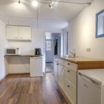 Bijkeuken met witgoedaansluitingen, kitchenette met gootsteen en tuindeur