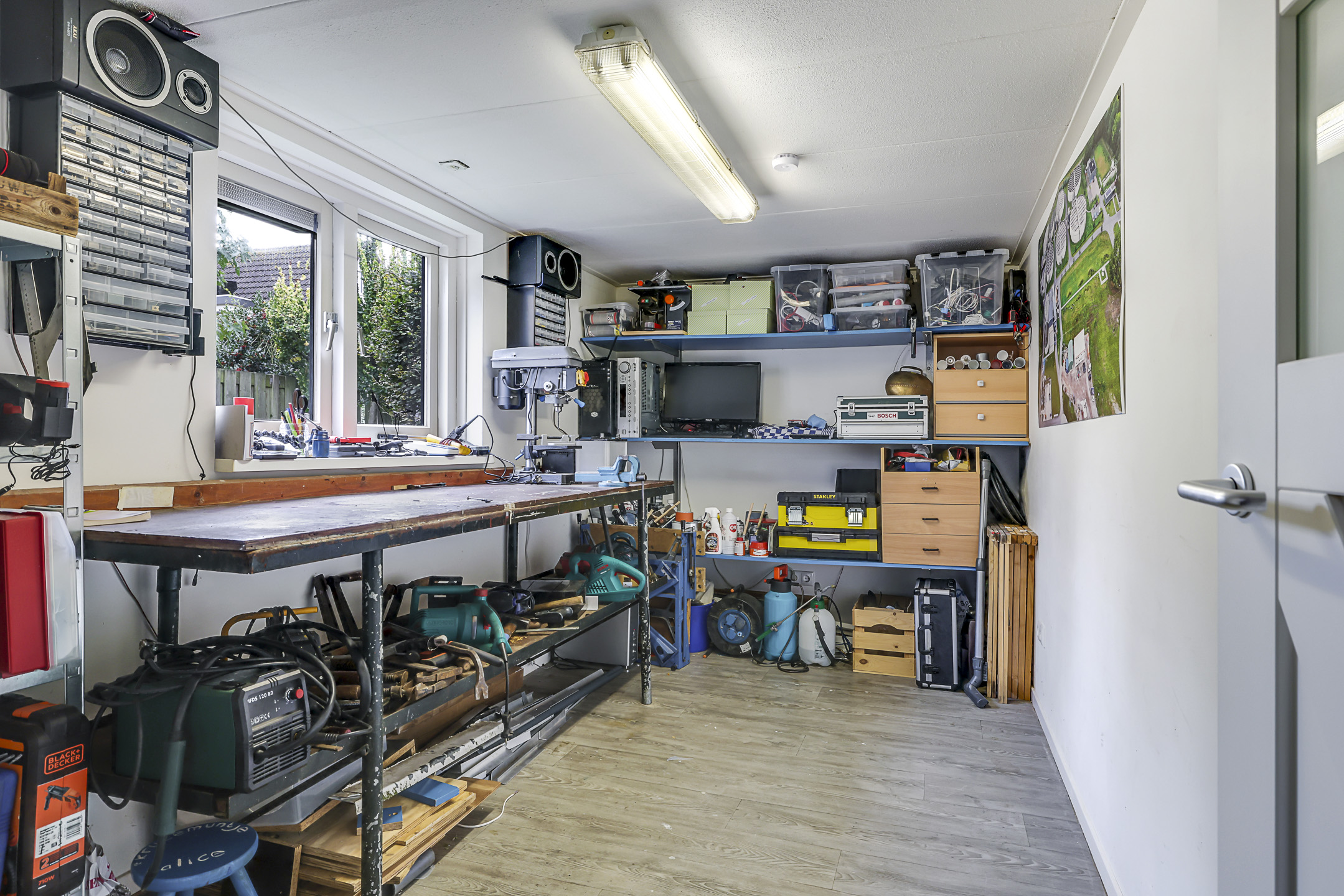 Nog geen 10 jaar geleden is de woning achter de bijkeuken uitgebouwd. Hier is een extra werk/hobbykamer (ca. 10m2) gerealiseerd hetgeen de woning veelzijdig te bewonen maakt. In de huidige setting is deze kamer ingericht als klusruimte, maar je kunt hier ook prima een bureau kwijt. De aanbouw is volledig geïsoleerd en verwarmd waardoor de kamer aangenaam is. Je zou ook kunnen denken andere hobby’s of er zelfs een slaapkamer maken. Wanneer je een deel van de bijkeuken (waar aansluitingen aanwezig zijn) verbouwd tot badkamer, zou je deze woning zelfs levensloopbestendig kunnen bewonen.