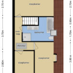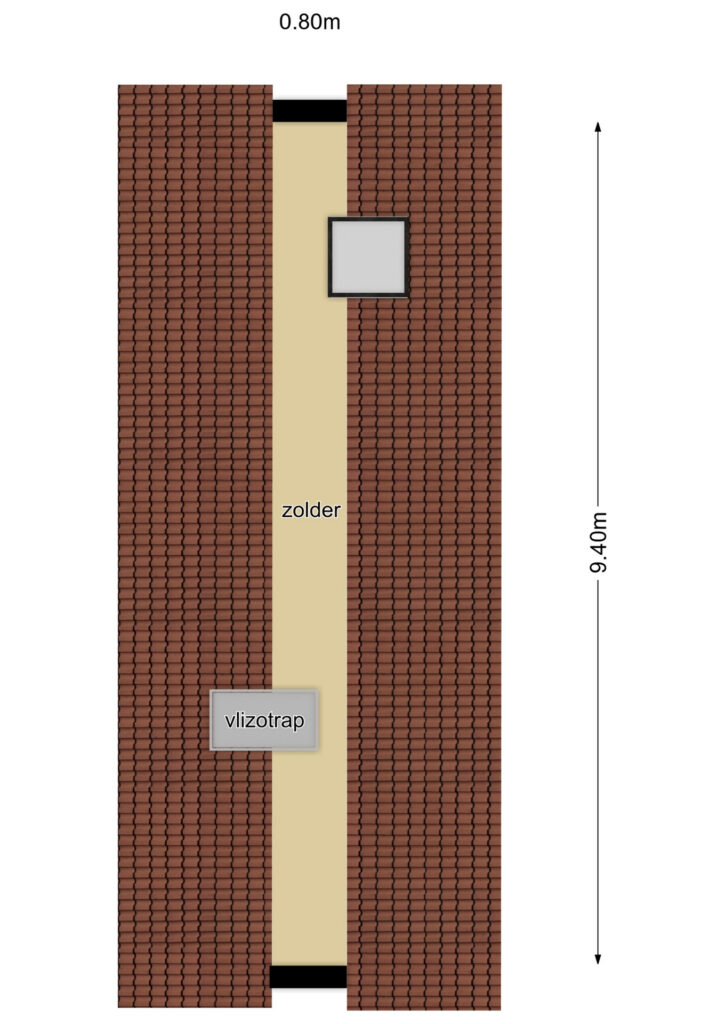 Via de overloop en een vlizotrap is de zolder te bereiken. Deze is nog verrassend ruim, geheel bevloerd en loopt over de volle lengte (9,3m) van de woning door. De nok ligt op 1,7m hoogte waardoor het net niet beloopbaar is. Overigens vinden we hier wel veel opbergruimte voor bijvoorbeeld vakantiespullen terug. Vanuit praktisch oogpunt is ook hier een dakvenster geplaatst (2012). Ook vinden we hier de CV-ketel alsmede de MV-unit terug.