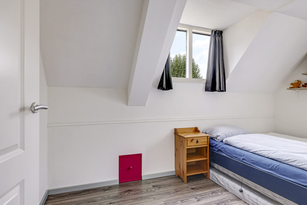 Wanneer je in de hal staat, zal je één ding zeker opvallen: de traprenovatie met verlichting. Deze stijlvolle trapopgang brengt je naar de 1e verdieping waarbij de overloop 3 slaapkamers en de badkamer aan elkaar schakelt. De hoofdslaapkamer heeft de volle breedte van de woning en is aan de achterzijde gelegen. Omdat dit ook de zonnige kant is, is hier een elektrisch bedienbaar rolluik geplaatst. Hierdoor kun je deze kamer 100% verduisteren. Aan de voorzijde vinden we de 2 andere slaapkamers terug waarvan er één een kleine dakkapel heeft. Overigens is er nauwelijks ruimteverlies door schuine dakvlakken, omdat de gevels vrij hoog doorlopen. En mocht je ‘out-of-the-box’ willen denken dan zou je in één van de slaapkamers een ‘slaapvide’ kunnen maken. Je maakt de slaapkamer dan groter door een slaapgedeelte op de 2e verdieping te maken.