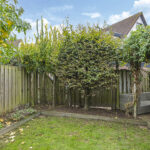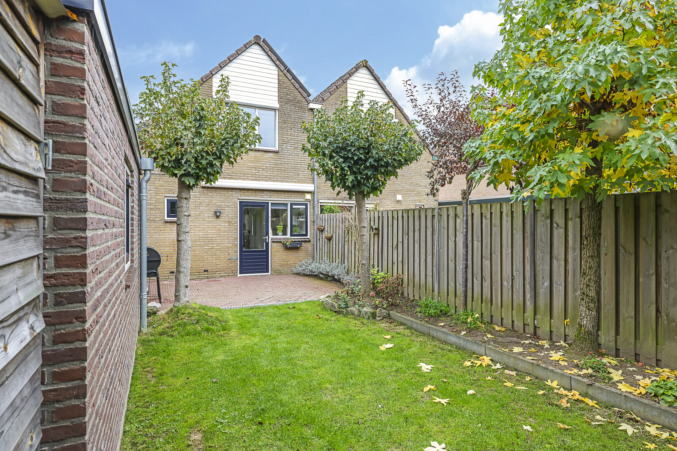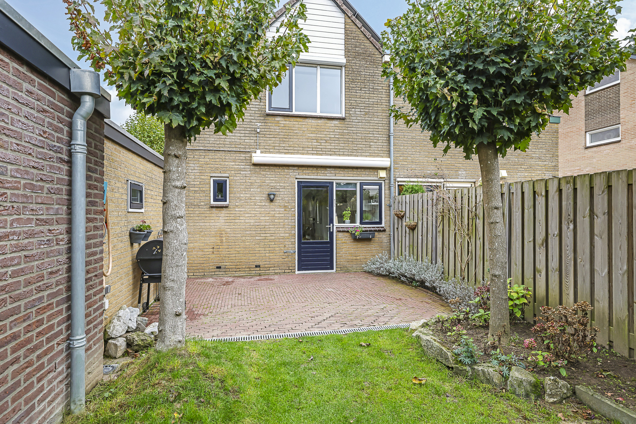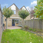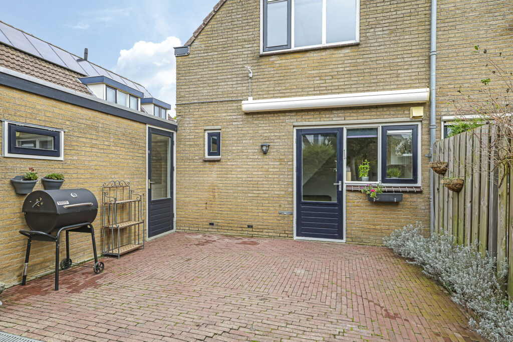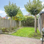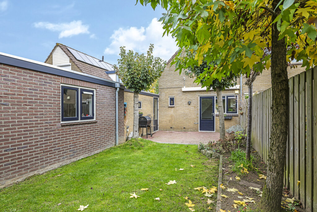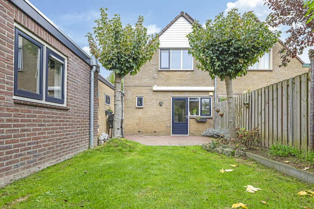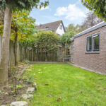 De achtertuin is groen omsloten en biedt relatief veel privacy. Zowel voor- als achterin is er een terras aangelegd met in het midden een verzorgd gazon. Door de gunstig ligging heeft de tuin veel zonuren. Op de oprit is plaats voor 2 auto’s.