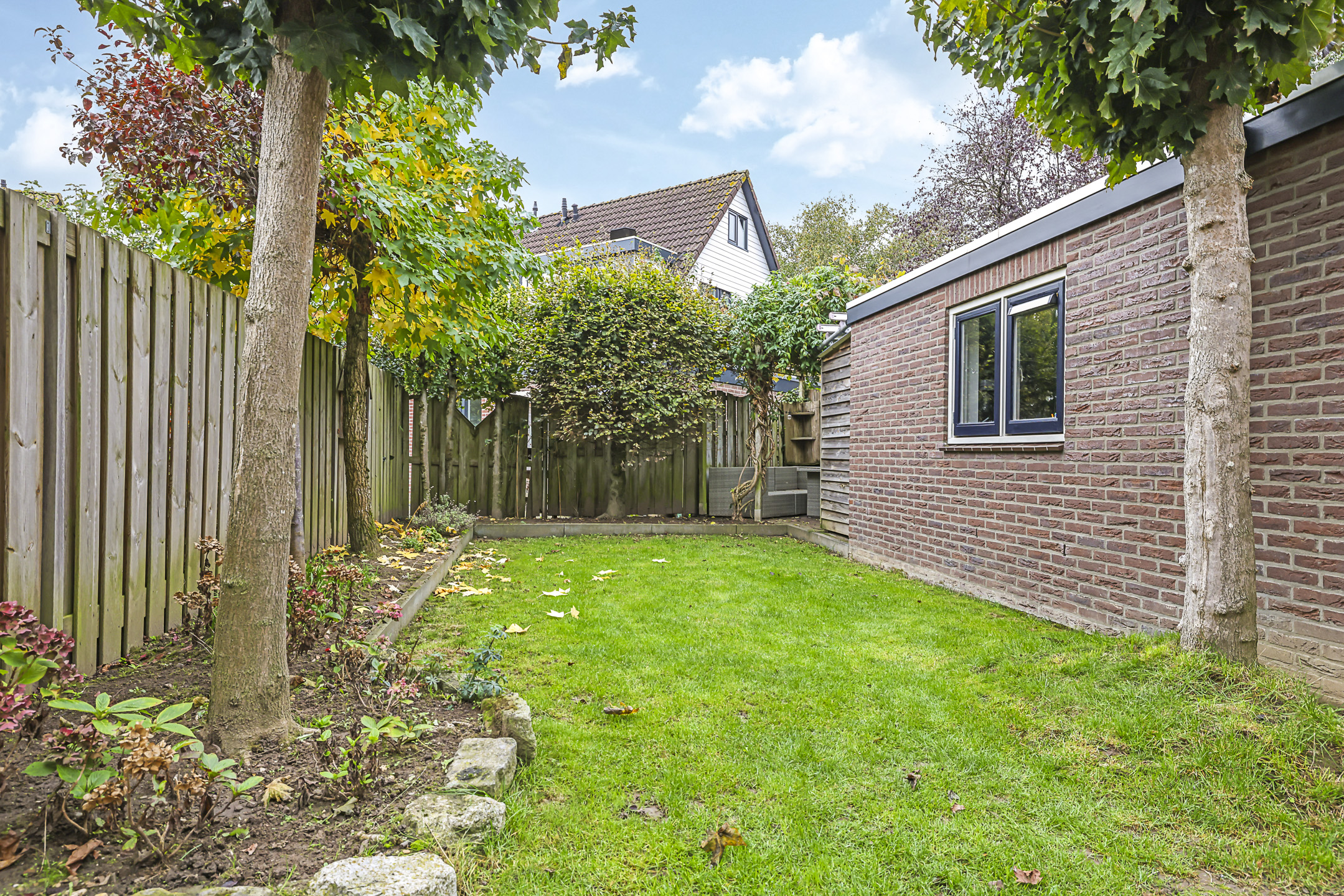 Ben je een tuinliefhebber, dan zal je deze tuin zeker aanspreken. De relatief diepe tuin heeft een groen en intiem karakter waarbij diverse boomsoorten en het uitgestrekte grasgazon voor een serene rust zorgen. Achterin de tuin biedt een terras met pergola een 2e terras. Bovendien ligt de woning relatief vrij en is er nauwelijks inkijk. En om het (voor veel mensen) nog aantrekkelijker te maken: deze tuin ligt op het zonnige zuid/westen waarbij je de gehele dag, van ’s morgens vroeg tot ’s avonds laat van de zon kunt genieten. In de tuin zijn diverse elektrapunten aangelegd alsmede een watertappunt. Ook is de afwatering bij het zitterras goed geregeld doordat er een drain is aangebracht.